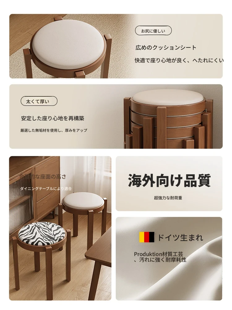 スタイリッシュな実木製スタッキングスツール - 中古風の高級感溢れるソフトパッケージラウンドスツール、場所を取らず、家庭用にも最適なダイニングチェア!