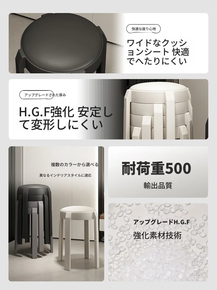 スタイリッシュな厚手プラスチックスツール – 家庭用、軽量で重ねられるデザイン!ラグジュアリー感溢れるソフトパック円形スツールは、リビングやゲスト用のサブスツールに最適です。おしゃれで実用的なアイテムをぜひお試しください!