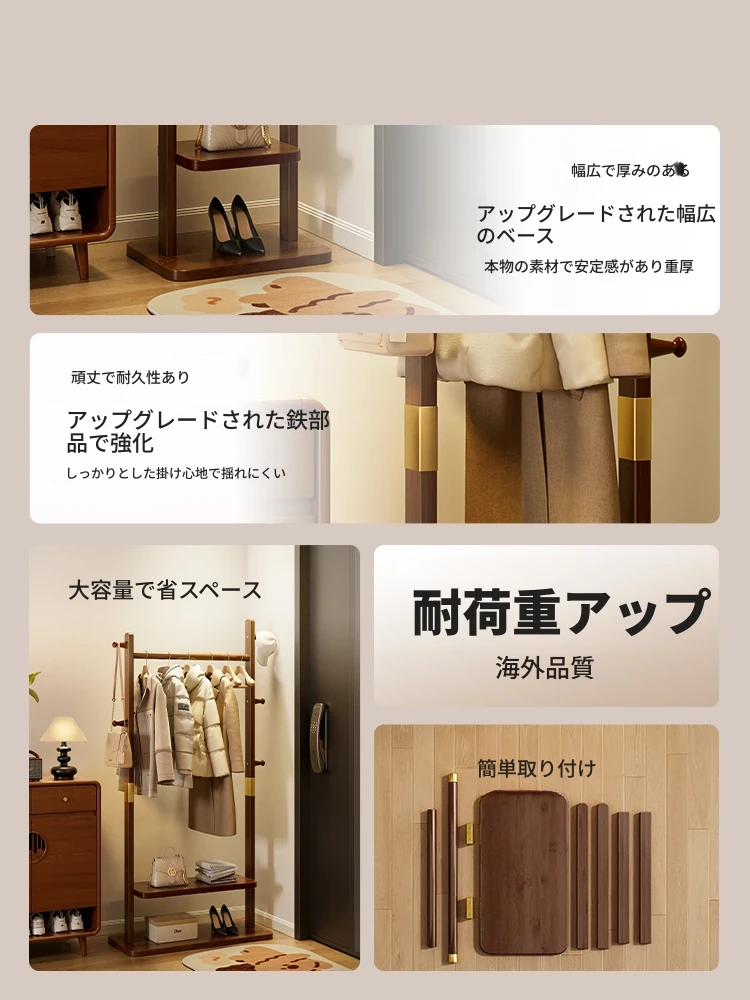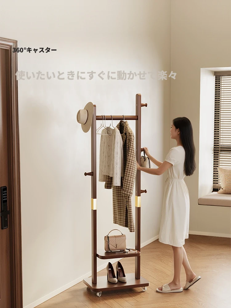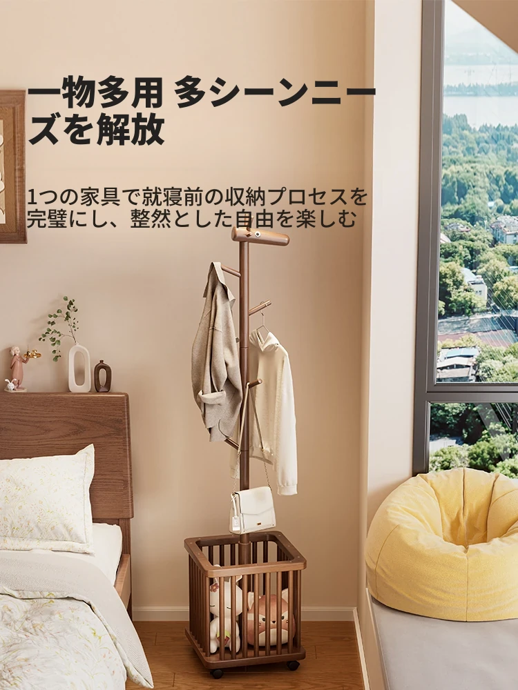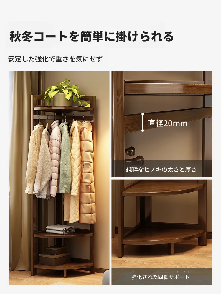 新型実木製スタンド式衣類掛け、コンパクトなコーナー型コートラック!玄関や寝室に最適、衣服やバッグをスマートに収納。おしゃれで便利な生活空間を演出します!