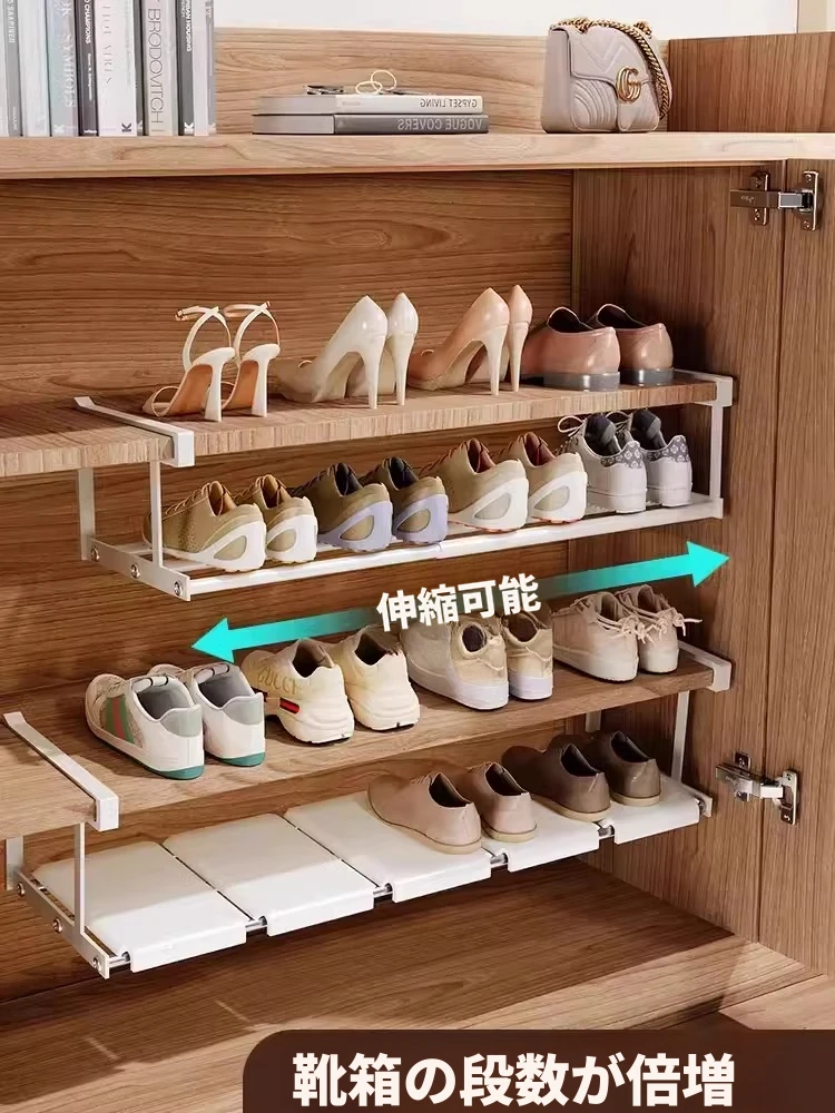 穴あけ不要!伸縮式シューラック - 家庭用シューズキャビネット、層分け棚で靴をすっきり収納。省スペースの収納マジック!あなたの靴を美しく整理整頓します。
